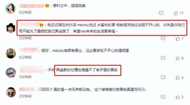 网友们在看到Melody离婚的消息后,纷纷祝福她,没必要被不幸福的婚姻所束缚,就像Melody在节目中说过的那样,女人先是自己,