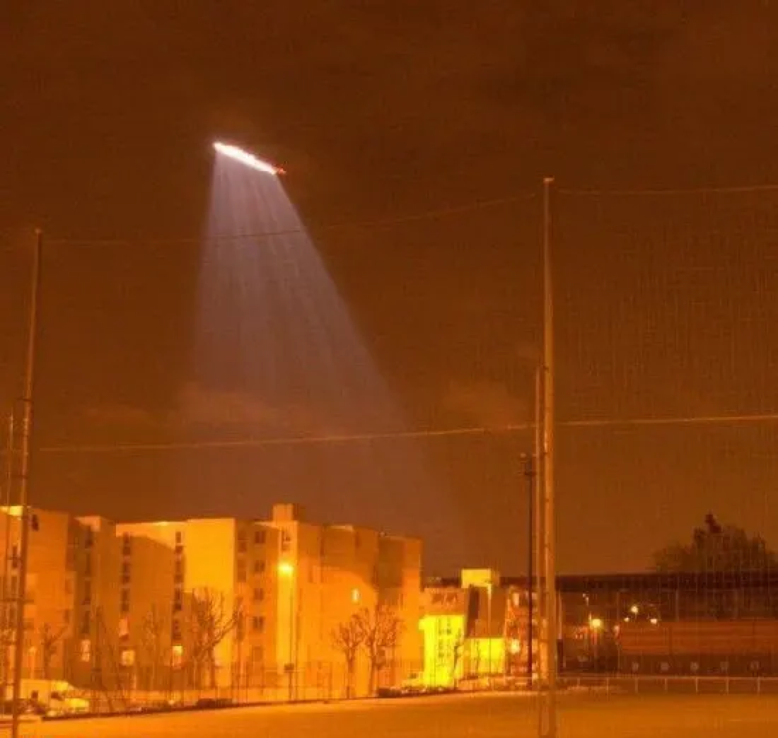 然而其实这是2007年法国总统大选之后,直升机正在监视当地可能发生的骚乱或抗议活动,照片中梯形的光束,是直升飞机下方的探照灯,这种拍摄效果,也是相机长时间曝光所导致的。