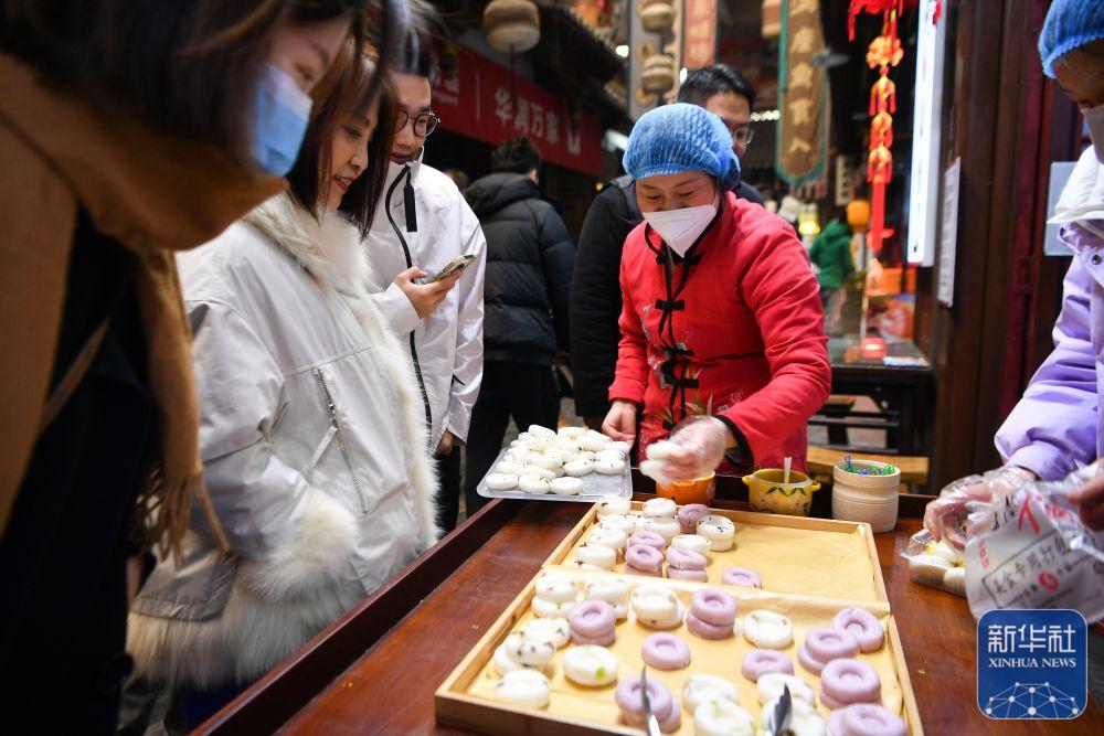 1月24日,在位于陕西省咸阳市的福园巷子街区,顾客选购刚制作好的米糕。新华社记者 张博文 摄
