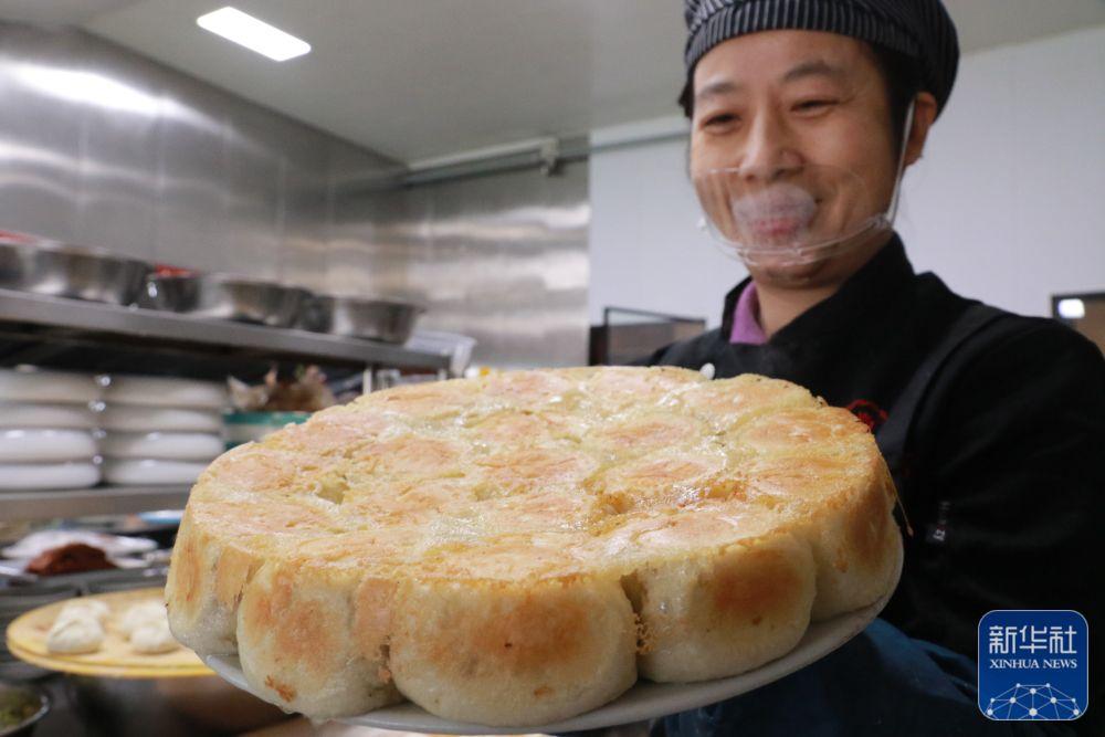 1月24日,在山东省高密市一家酒店内,厨师展示刚刚出锅的当地传统美食“高密炉包”。新华社发(李海涛摄)